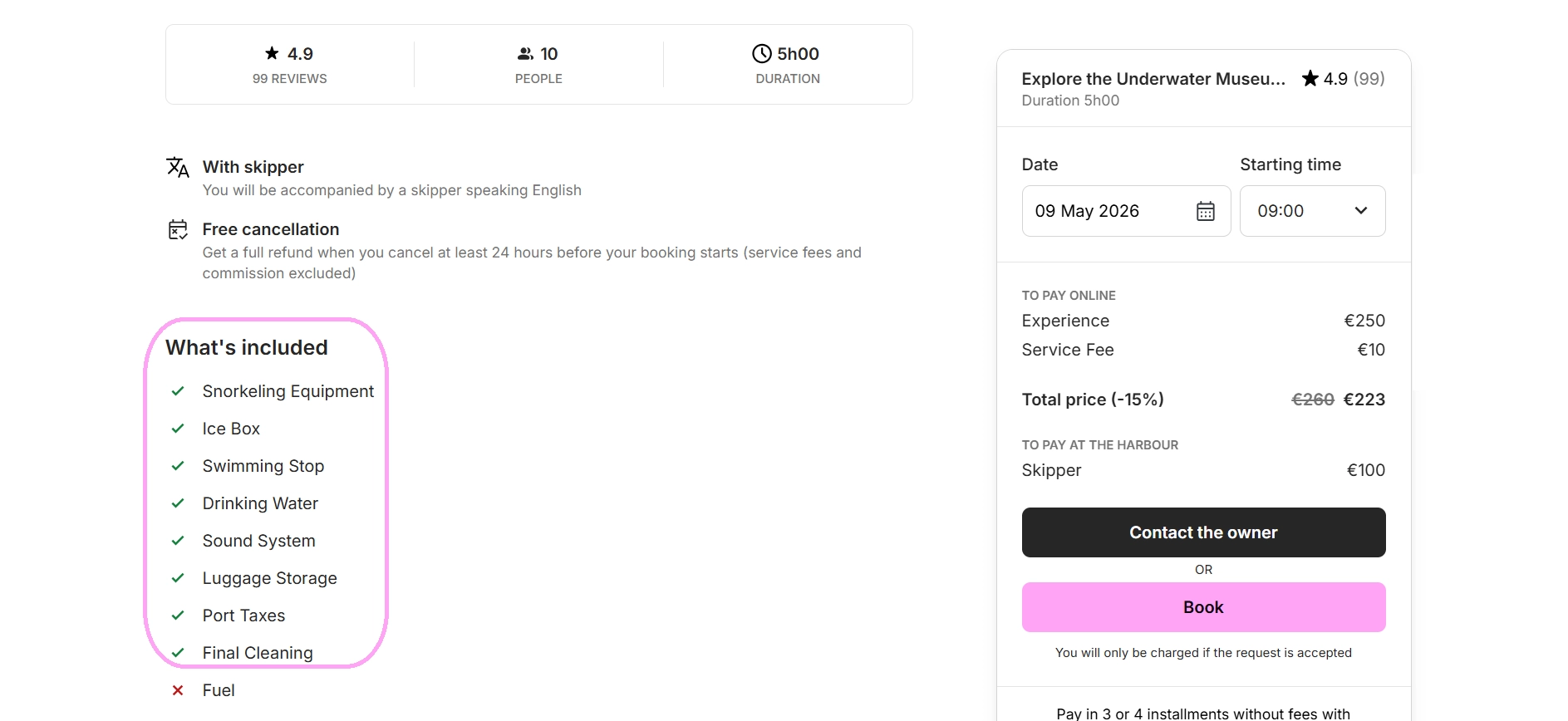 • Experience + Skipper + Kraftstoff werden online bezahlt