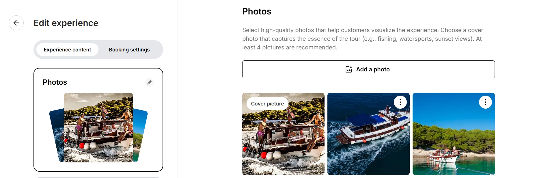 • Wählen Sie ein aussagekräftiges Titelbild. Wenn Sie mehrere Aktivitäten mit demselben Boot anbieten, verwenden Sie unterschiedliche Titelbilder, um Ihr Angebot hervorzuheben!