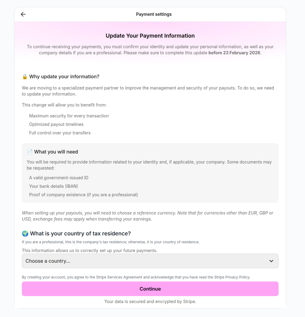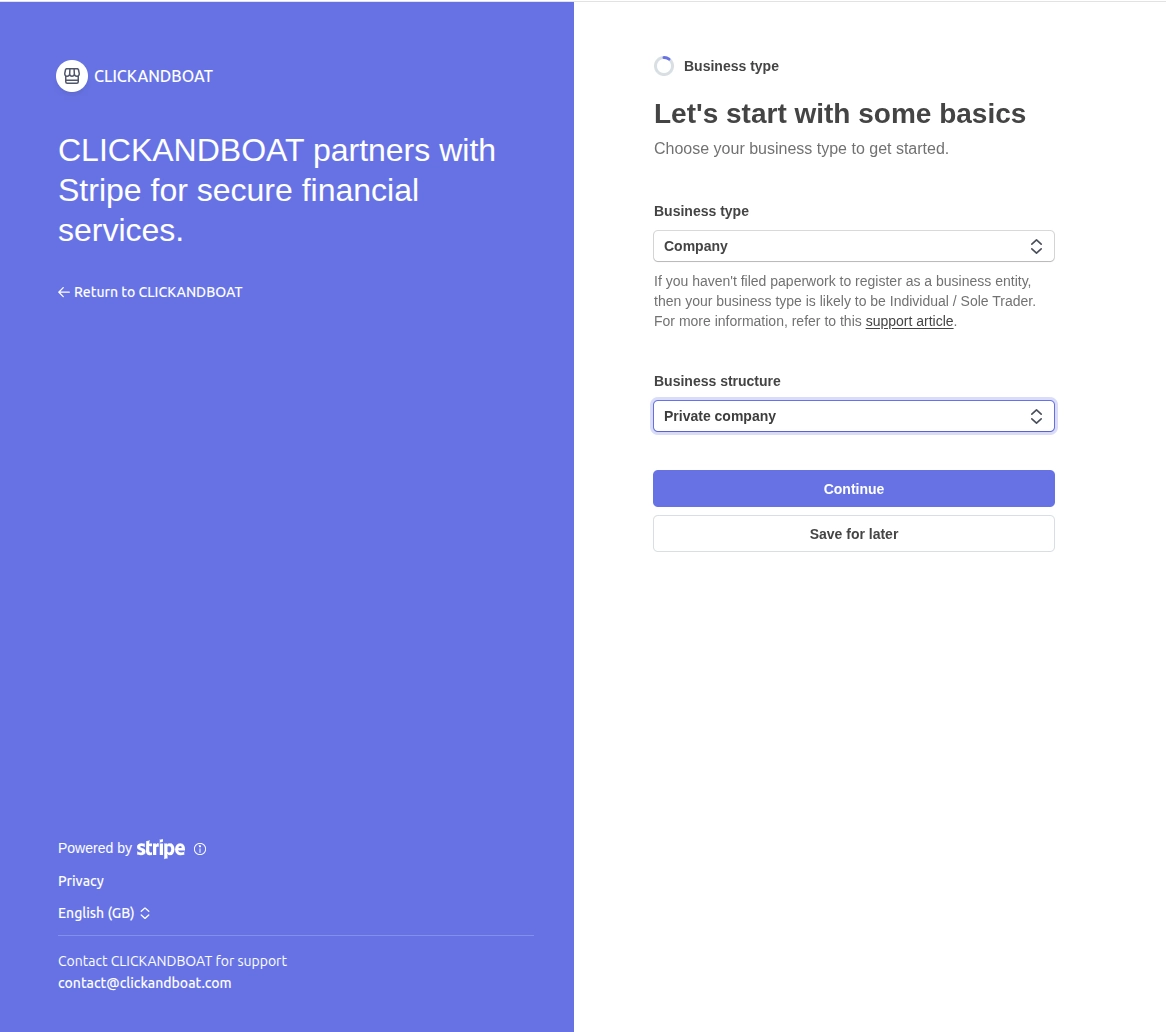 Para ofrecerle la máxima seguridad y pagos más rápidos, Click&Boat se ha asociado con Stripe Connect. Este proceso de verificación obligatorio — a menudo llamado KYC (Know Your Customer) o KYB (Know Your Business) — es un requisito legal estándar para el movimiento global de dinero.