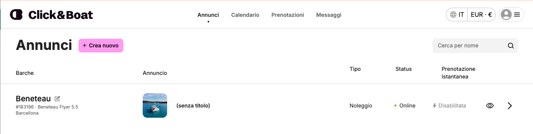Hai ora raggiunto la tua dashboard personale di gestione della flotta: qui puoi vedere e accedere a tutti i tuoi annunci di barche e alle tue esperienze